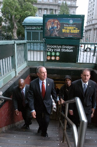 资料图片:2005年10月7日,在美国纽约,纽约市长布隆伯格(左二)乘坐地铁后走出市政厅地铁站。新华社发