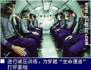 历史是最严厉的老师。前人血的教一样严阵以待。训练中最危险的是管道脱险,潜艇“失事”后,学员迅速钻进鱼雷管,“咣当”一声,潜艇后盖关闭,眼前一片漆黑,突然,前盖打开,海水汹涌扑来。学员必须在直径五六十厘米的管道中,在每平方米上千公斤的气压下逃离。快了,会肺泡破裂,慢了,会二氧化碳中毒。情景危险而紧张!就是这样的训练,据《潜水医学》记载,美军21万人次中,发生肺气压伤等疾病者30例,死亡者4例,而潜艇学院却创造了21万人次无事故,安全率百分之百的世界记录。