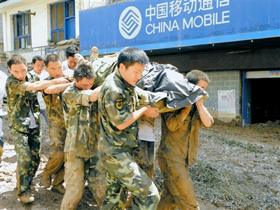 参加舟曲灾区救援的武警交通部队官兵正在紧急转运受伤群众。斯鑫杰摄