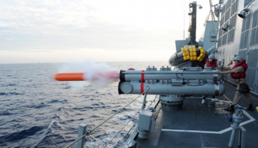 资料图:今年7月,美韩在日本海举行联合军演。图为参演军舰发射反潜鱼雷