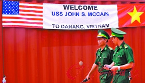 8月10日,美“麦凯恩号”驱逐舰抵越南岘港。越南方面打出标语和两国国旗,欢迎“麦凯恩号”到访。