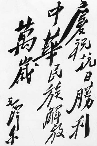 1945年9月,毛泽东为重庆《新华日报》的题词:“庆祝抗日胜利,中华民族解放万岁。”