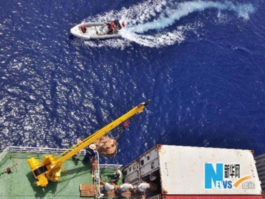 5月29日,在亚丁湾南部海域,中国参加护航任务的舰艇正在实施补给。