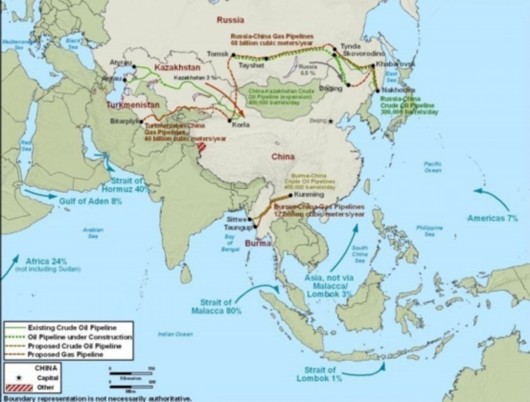 文章指出,中国为其能源战略还发展陆路输油管道,这样可以避免敏感的海陆运输。2008年,超过8成运往中国的石油途经马六甲海峡。为此,中国早在2006年就开始设计原油管道计划,以完成哈萨克斯坦输往中国每日20万桶的石油供应量,目前该管道已投入运营。新的工程将使日输油量增加到40万桶。另外,中国大庆至西伯利亚日输油量达30万桶的输油管道工程已于2009年5月开工。为提高能源战略的安全性,中国打算绕过马六甲海峡,从缅甸到中国昆明建造陆路输油管道线路,目前该计划已提上日程。