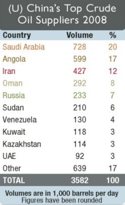 文章称,2008年,中国的石油消耗及石油储备占据该国进口石油总量的56%。据估计,到2015年,中国所需石油的2/3将依靠进口,到2030年,这一数字将为4/5。目前,石油在中国能源消耗的比重仅为20%,煤矿资源仍然负担着70%的能源供给。有分析人士称,中国的石油进口情况自2000年以来没有过大的浮动,中国还将继续以波斯湾、中亚、非洲、南美为主要石油进口地,以满足该国能源消耗。