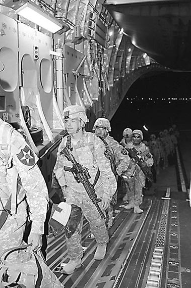 美军士兵于8月13日登上空军飞机准备从伊拉克返回美国