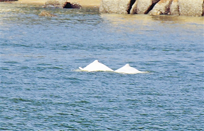 两只白海豚在艇边嬉水。湛 亮摄
