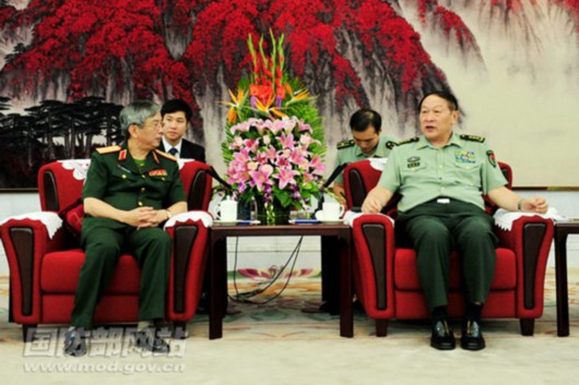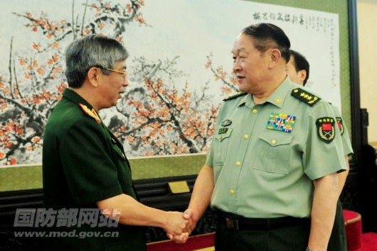 8月24日,国务委员兼国防部长梁光烈上将在八一大楼会见越南国防部副部长阮志咏中将。李晓伟摄