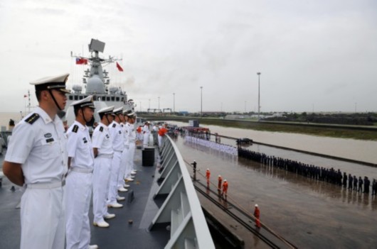 8月29日,中国海军第五批护航编队“广州”舰上的官兵在抵达缅甸仰光迪洛瓦港之际站在甲板上列队。新华社记者刘春晖摄