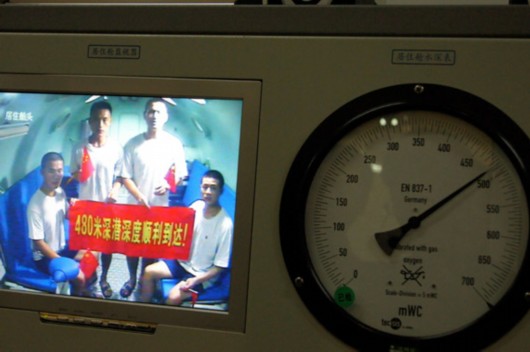 仪表显示实验舱内加压到480米,潜水员打出横幅纪念这一时刻 新华社记者 郑文浩 摄