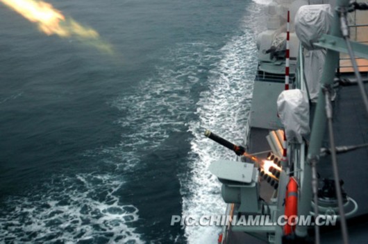 资料图:中国海军051C级116号驱逐舰在演练中发射干扰弹。 中国军事图片中心 许海宁 摄