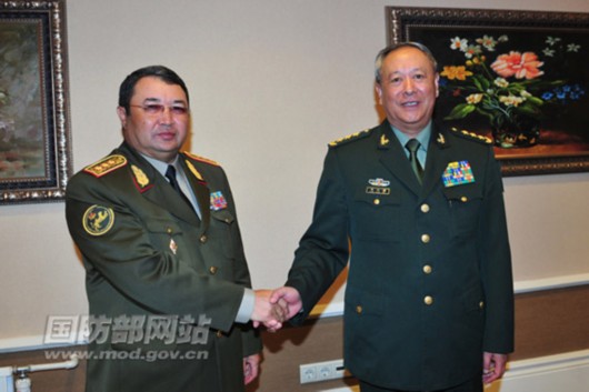 前来参加“和平使命—2010”上海合作组织联合反恐军演战略磋商的中央军委委员、总参谋长陈炳德,9日在阿拉木图会见了哈萨克斯坦共和国国防部第一副部长兼参谋长委员会主席扎苏扎科夫上将。