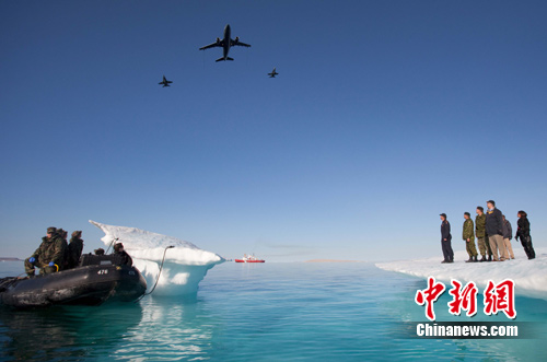 两架CF-18战斗机和一架CC-150运输机越过哈珀头顶。资料图