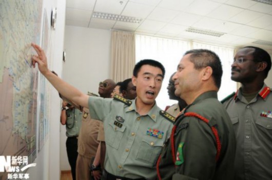 资料图:国防部维和事务办公室副主任陶向阳大校向外国驻华武官介绍国防部维和中心作战室情况。新华军事记者 赵薇 摄