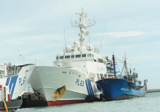 被日本海上保安厅扣留的中国渔船“闽晋渔5179”停靠在“与那国”号巡逻船旁