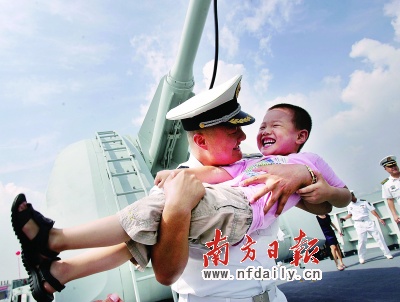 昨天“广州”舰抵达湛江后,激动的海军军官在舰上抱起了来迎接自己的孩子