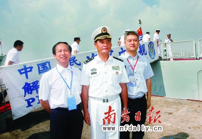 欢迎仪式一结束,第五批护航编队指挥员、南海舰队副参谋长张文旦少将即在“广州”舰的舷梯旁,与率队前来欢迎的南方报业传媒集团党委副书记、纪委书记朱正红(左一)及南方日报采访团队合影并表示感谢