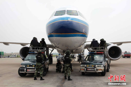 机场公安、武警和安检部门迅速对被劫飞机实施外围封控,武警反劫机中队特战队员乘坐防弹运兵车进入封控包围圈,利用各种先进技术手段进行现场侦察。