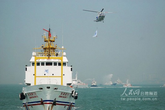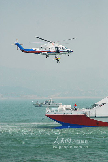 两岸10余艘船只和3架直升机参与的这次大规模海陆空联合演练