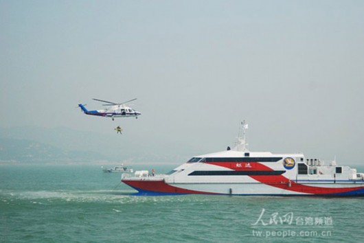 今日上午9时30分许,海峡两岸海上搜救部门在台湾海峡的厦门、金门附近海域举行联合搜救演练。