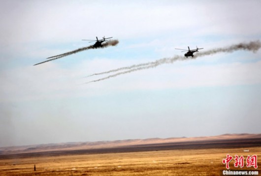 参演直升机从演习地域上空轮番实施打击,中新社发 孙自法 摄