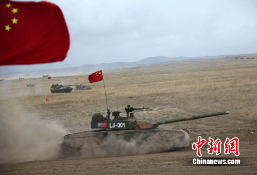 “和平使命-2010”进行全要素全过程实兵合练,图为中方参演坦克、轮式战车等装备挺进演习地域。孙自法 摄