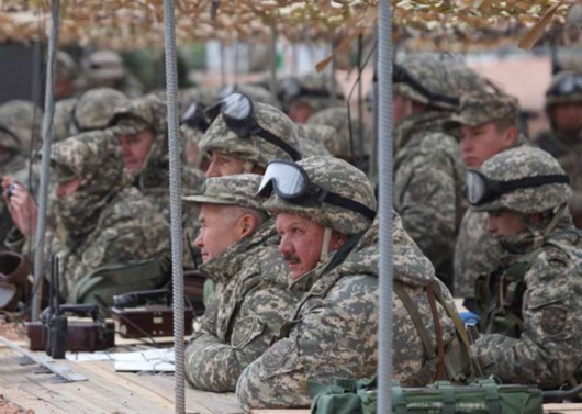 在哈萨克斯坦南部的马特布拉克训练场上,参加“和平使命-2010”联合军演的哈、中、吉、俄、塔五国官兵密切配合,在野战兵营这个临时的共同家园中友好相处,结下了深厚的友情。