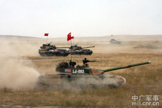 上合军演实弹演练现场,解放军参演99坦克轮式突击炮冲锋