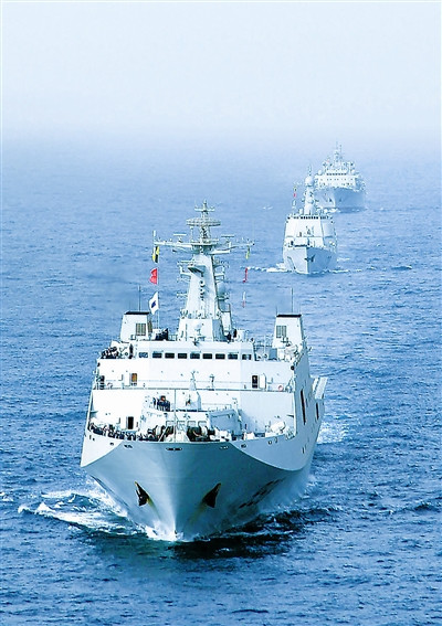 “昆仑山”舰领衔的第六批护航编队三艘军舰。