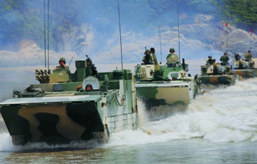 国庆前夕,南京军区某装甲团海上登陆作战演练在某海域打响。百里海疆,风高浪急。12辆两栖装甲突击车在海空火力掩护下如蛟龙跃入深海,向目标滩头急速挺进。
