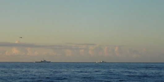 日方巡逻舰和直升机在钓鱼岛附近跟踪我国渔政执法船。来源:环球网