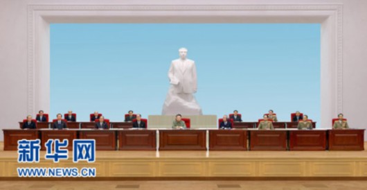 这张朝鲜中央通讯社9月29日发布的照片显示的是28日在平壤召开的朝鲜劳动党代表会议会场主席台。朝鲜最高领导人金正日出席了此次会议。新华社/朝中社