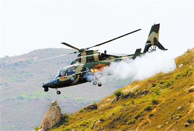 武装直升机发起对地面目标攻击瞬间。本报特约记者 李三红摄