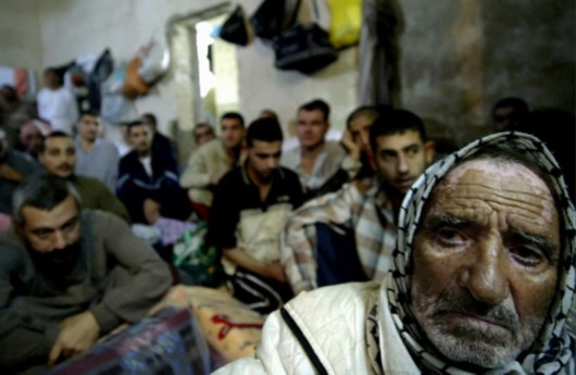 图为维基解密公布的照片。2005年11月,数十名伊拉克囚犯坐在巴格达阿尔-纳苏尔监狱的地面上,其中绝大部分是逊尼派穆斯林。