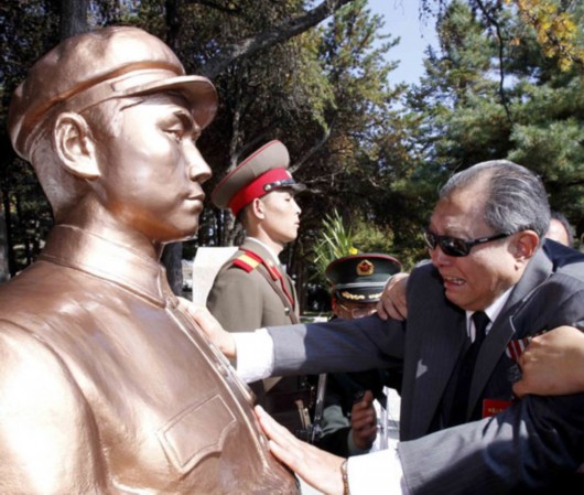 在中国人民志愿军入朝参战60周年之际,正在朝鲜进行友好访问的志愿军老战士代表团24日赴桧仓志愿军烈士陵园进行祭奠。这是老战士们在毛岸英烈士铜像前祭奠。本报记者 王卫东摄