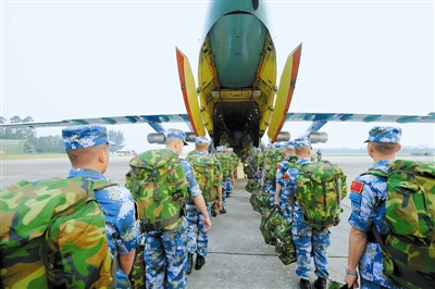 我海军陆战队两栖特战分队官兵乘坐空军运输机飞赴泰国。 本报特约记者 李 唐摄