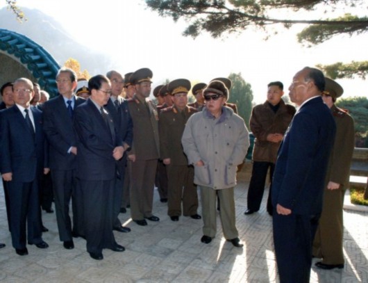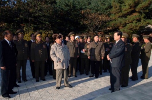 10月26日,朝鲜最高领导人金正日(右四)率25名朝鲜党军高层领导人前往桧仓,向志愿军烈士墓及毛岸英烈士墓敬献花圈。金正日一行还参观了志愿军司令部旧址。新华社/朝鲜中央通讯社