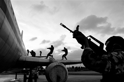 时间已近中午,“恐怖分子”提出送餐要求。红方指挥员、武警特警学院特战大队大队长刘爱军下令:“各组注意,按第一套战斗方案,进行战斗准备!”4名特战尖兵巧妙隐蔽,就在歹徒打开机舱门的瞬间,强光灯骤然射向客机,特战队员以迅雷不及掩耳之势发起攻击,枪枪中敌,人质毫发无损。