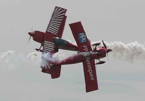 “红鹰”队成立于20世纪80年代初,由队长丹麦克伦和飞行员巴克莱特曼组成,在北美大陆家喻户晓,几乎参加过美国各大航展。 表演机是两架“克里森鹰”,浑身通红,左右两侧机身各绘有一个疾驰状的白色鹰头。