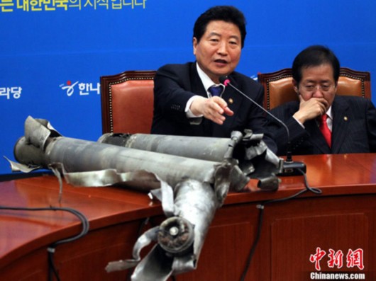 当地时间11月25日,韩国国大党公布两枚朝鲜炮弹的残骸,谴责朝鲜炮击延坪岛的行为。