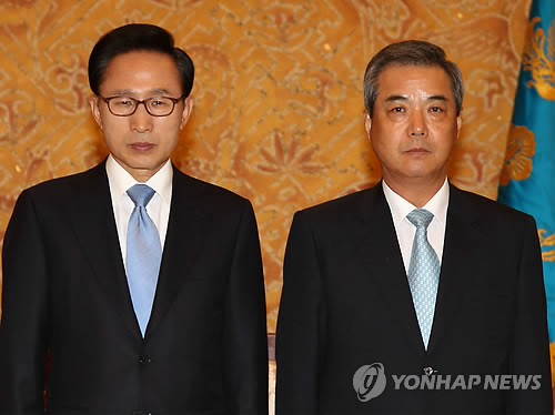 现任青瓦台安保助理的李熙元被指名为国防部长官。图为今年5月同李明博总统的合影。韩联社