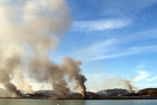 11月23日,遭遇炮击的韩国延坪岛硝烟弥漫