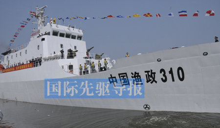 16日上午,中国第一艘配载直升机的渔政执法船——渔政310,驶离广州前往钓鱼岛巡航。本报记者 梁钢华 摄