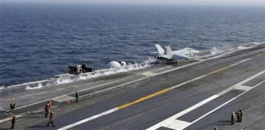 美军华盛顿号航母将参加美日军演。图为一架超级大黄蜂战机正降落到华盛顿号航母上