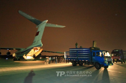 资料图:6月23日凌晨,广空运输航空兵伊尔-76运输机准备装载救援物资送往青海玉数地震灾区