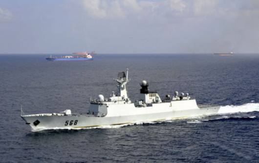 “巢湖”舰正为商船护航。