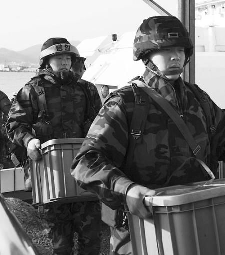 18日,在韩国延坪岛港口,韩国海军陆战队员搬运物资。 新华社记者 何璐璐摄