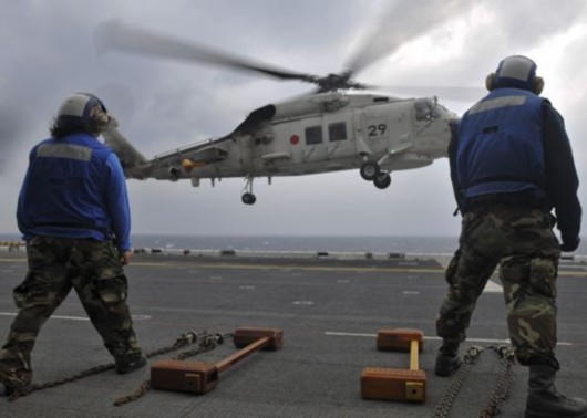 2010年12月7日,东海海域,美日海上力量正在西太平海进行两国有史以来规模最大的联合军演。图为日本海上自卫队SH-60K反潜直升机正准备在美国海军USS Essex(LHD 2)埃塞克斯号两栖攻击舰上降落,此科目是在锻炼两军海上舰机协同能力。