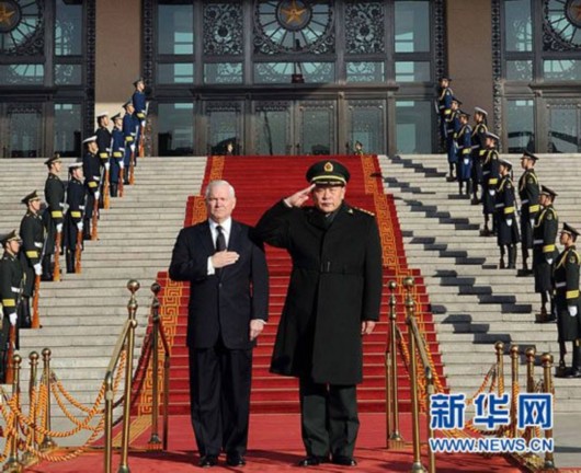 1月10日,中国国务委员兼国防部长梁光烈在北京举行仪式欢迎美国国防部长盖茨访华。 新华社记者 李涛 摄
