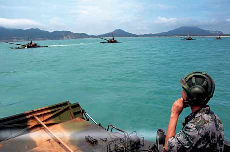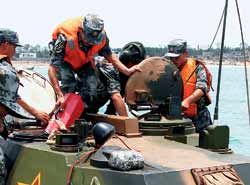 蓝天碧海,蛟龙游弋。东南某海域,风急浪高,重达20多吨的水陆两栖坦克在茫茫沧海中宛如一叶扁舟,车上的潜望镜不时被溅起的浪花淹没,炮手透过瞄准镜看2000米开外的目标靶如雾里看花。此时驻闽某装甲旅正在进行海上实弹射击。